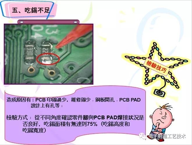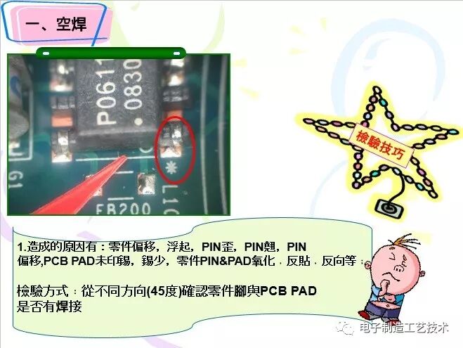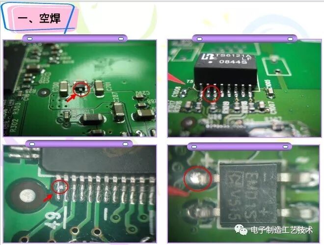 空焊:零件脚或引线脚与锡垫间没有锡或其它因素造成没有接合